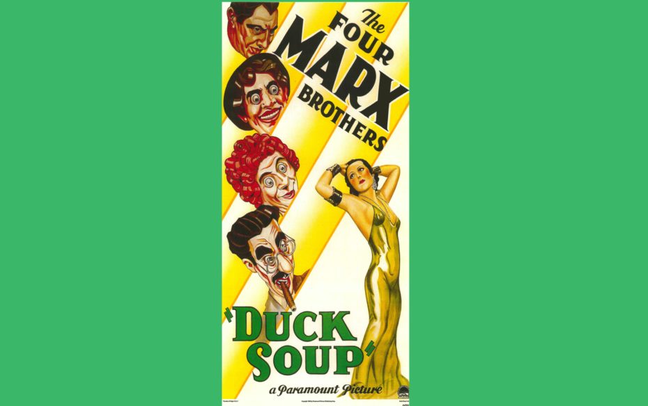 1933. Leo McCarey. B&W. 70 min. The Marx Brothers (Groucho, Chico, Harpo, Zeppo) in a lunatic plot about a mythical kingdom, where Groucho becomes prime minister. The last Marx Brothers film to feature Zeppo. Featuring Margaret Dumont.