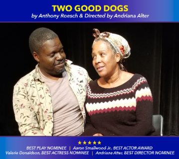 Aaron Smallwood Jr., the recipient of the Best Actor Award for his role as the Old Man in Two Good Dogs by Anthony Roesch, is happy to reprise his role. His credits include, film: Suspicion (Austin Film Festival), In/Finite (Amazon Prime); Television: Elvis Lives Here (Ep 318), and Theatre: Hurt Village (The Acting Studio), Bros From the Bottom (The Acting Studio), and Lazarus (Hudson Guild Theater). Two Good Dogs is about two homeless people who sit by the Chicago River discussing life, racism, love, loss and two good dogs. The cast is rounded out by Valarie DonaldsonBest Actress Award Nominee as the Old Woman, and Amy Stapleton as The Young Woman. Adriana Alter, Best Director Award Nominee, has extensive directorial and dramaturgical experience including work with the Secret Theatre, Hip to Hip Theatre Company, Chelsea Rep/The Acting Studio, Nicu’s Spoon Theater Company, Identity Theater Company, Royal Family Productions, and Hartford Stage. Favorite recent projects include the world premiere of Bridges and Overpasses, also by Anthony Roesch! Mr. Roesch is also a fiction writer and has published stories appearing in Inkwell Journal and Tampa Review, and has been a Top-25 finalist in Glimmer Train’s Fiction Open and Very Short Story Competitions.