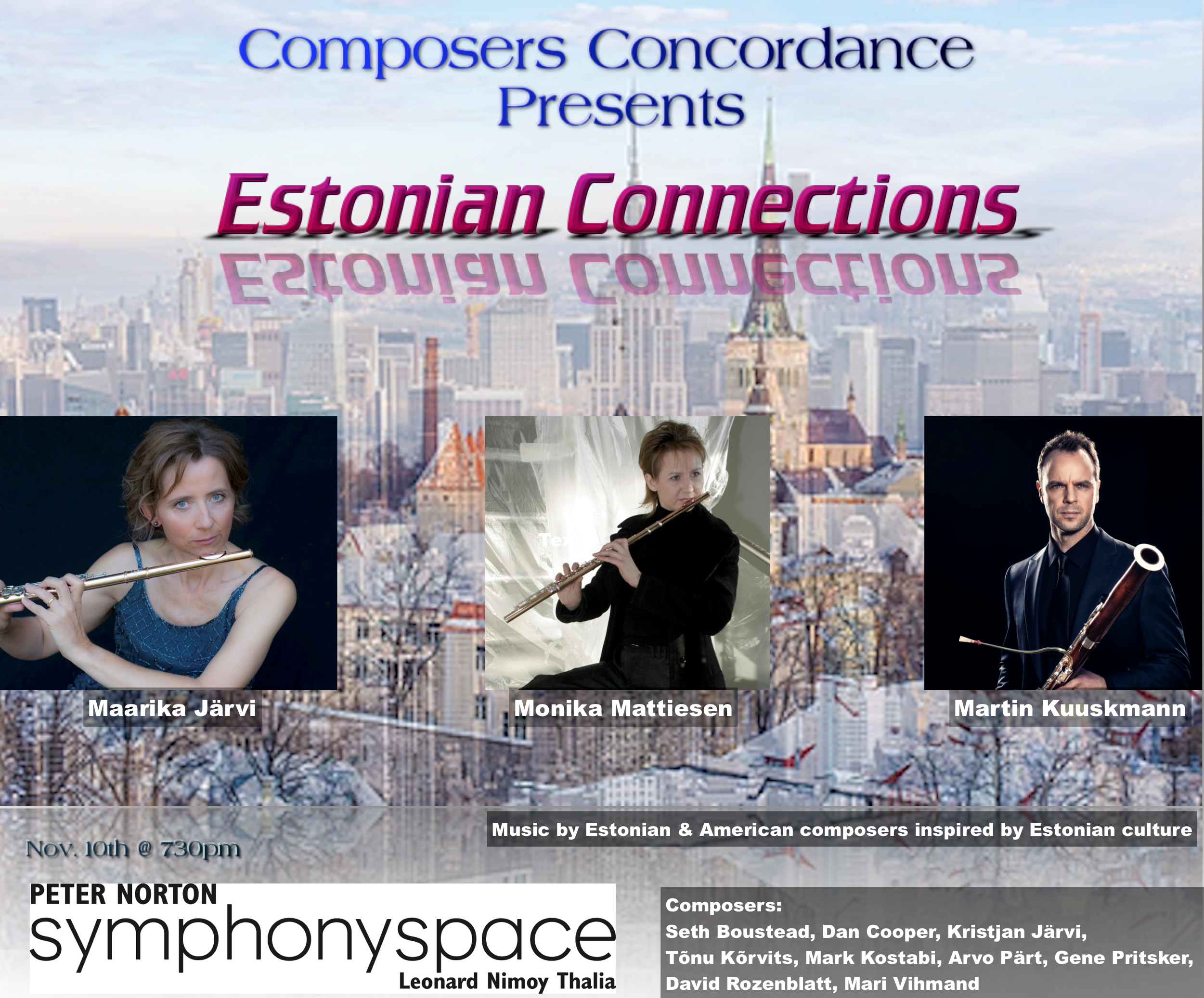 Composers Concordance presents 'Estonian Connections,' featuring flutists Maarika Järvi and Monika Mattiesen, bassoonist Martin Kuuskman, and the CompCord Ensemble, conducted by David Rozenblatt.