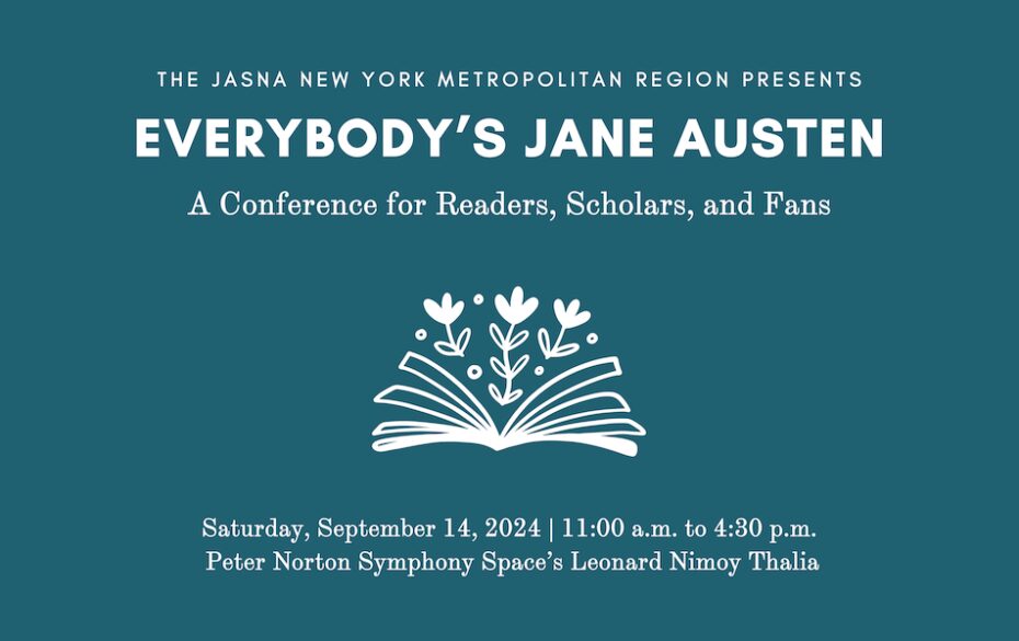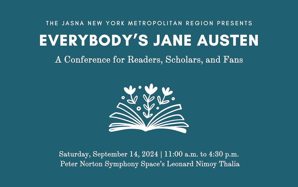 The Jane Austen Society of North America (JASNA) New York Metropolitan Region presents Everybody’s Jane Austen: A Conference for Readers, Scholars, and Fans at the Leonard Nimoy Thalia on Saturday, September 14, 2024.