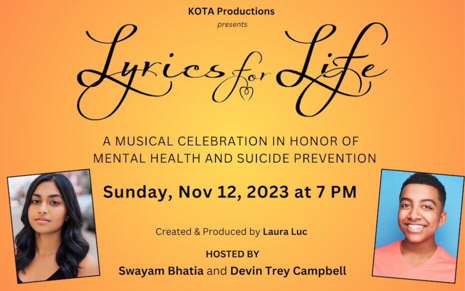 KOTA Productions' Lyrics for Life returns to Symphony Space for one-night only on Sunday, November 12, 2023 at 7:00 pm. A musical celebration in honor of mental health awareness and suicide prevention, Lyrics for Life aims to break the stigma surrounding mental health through the power of music.